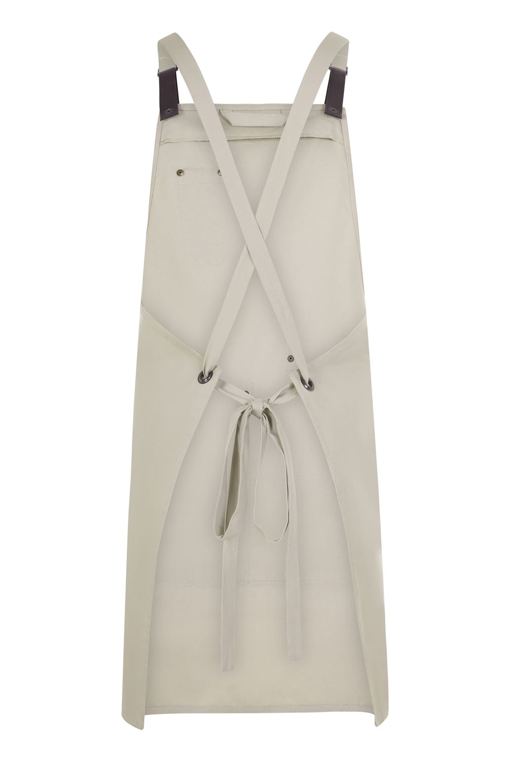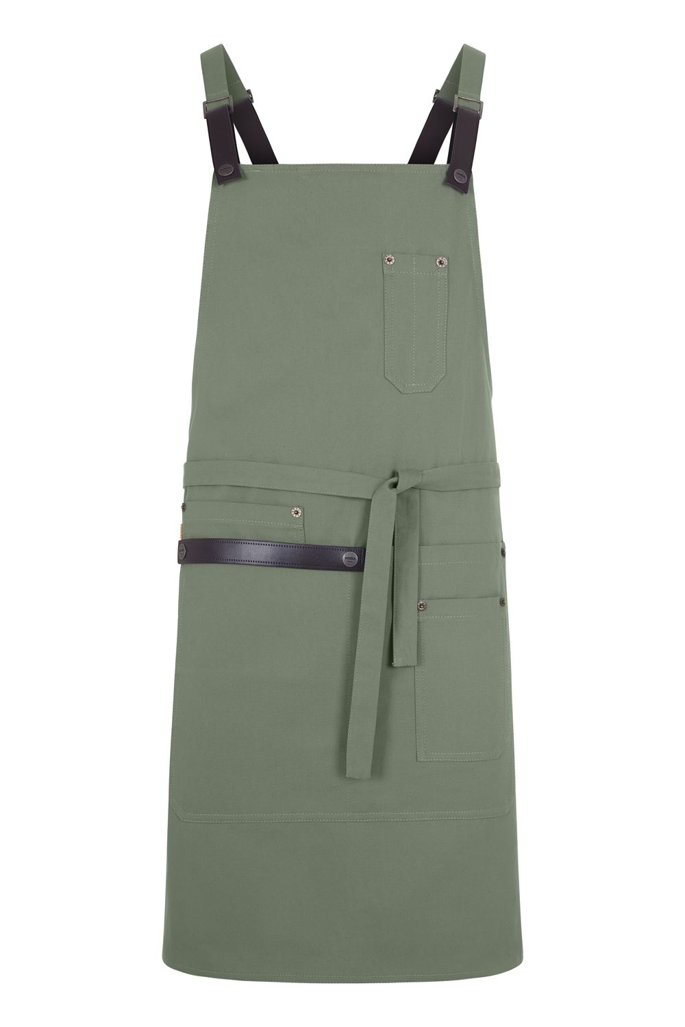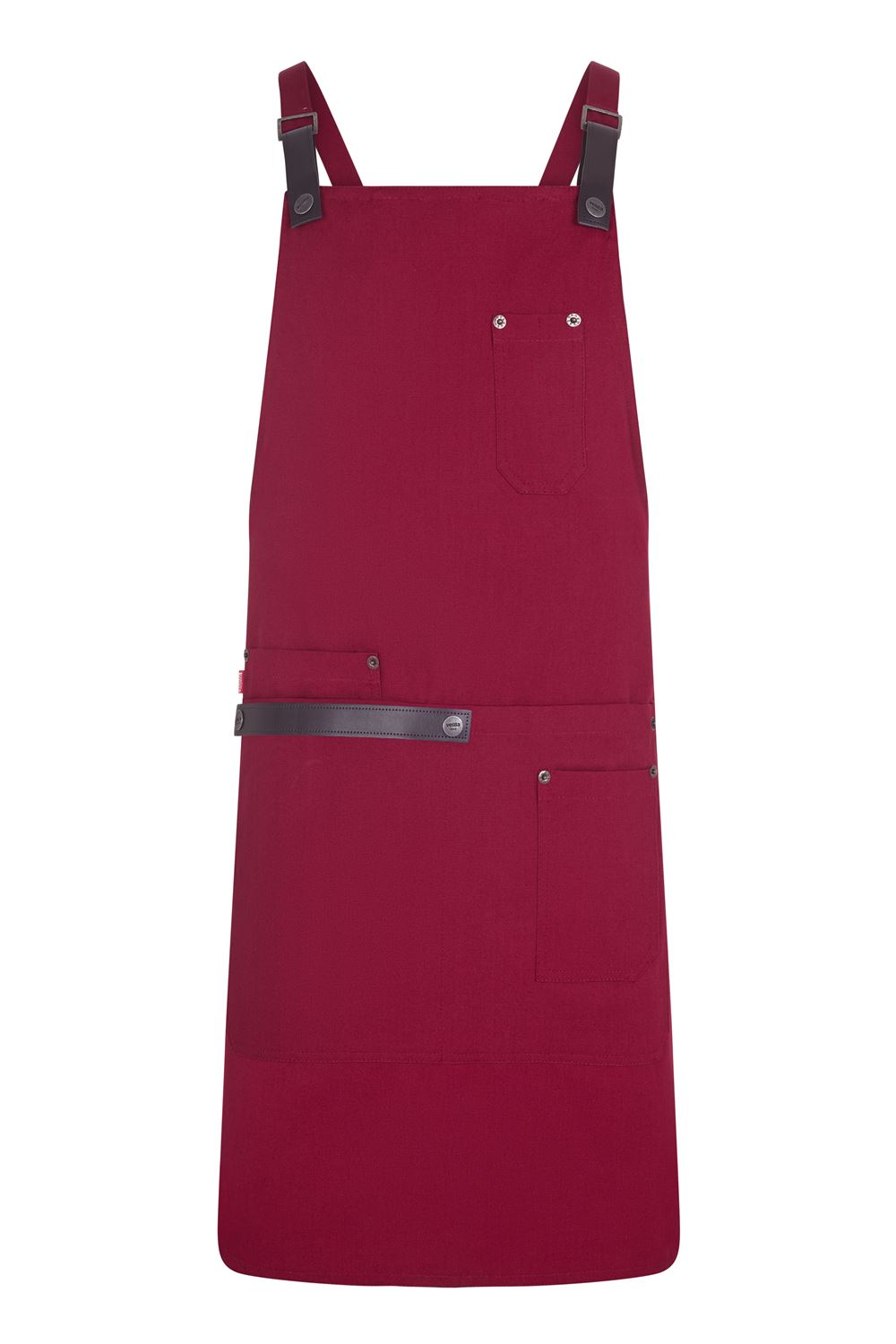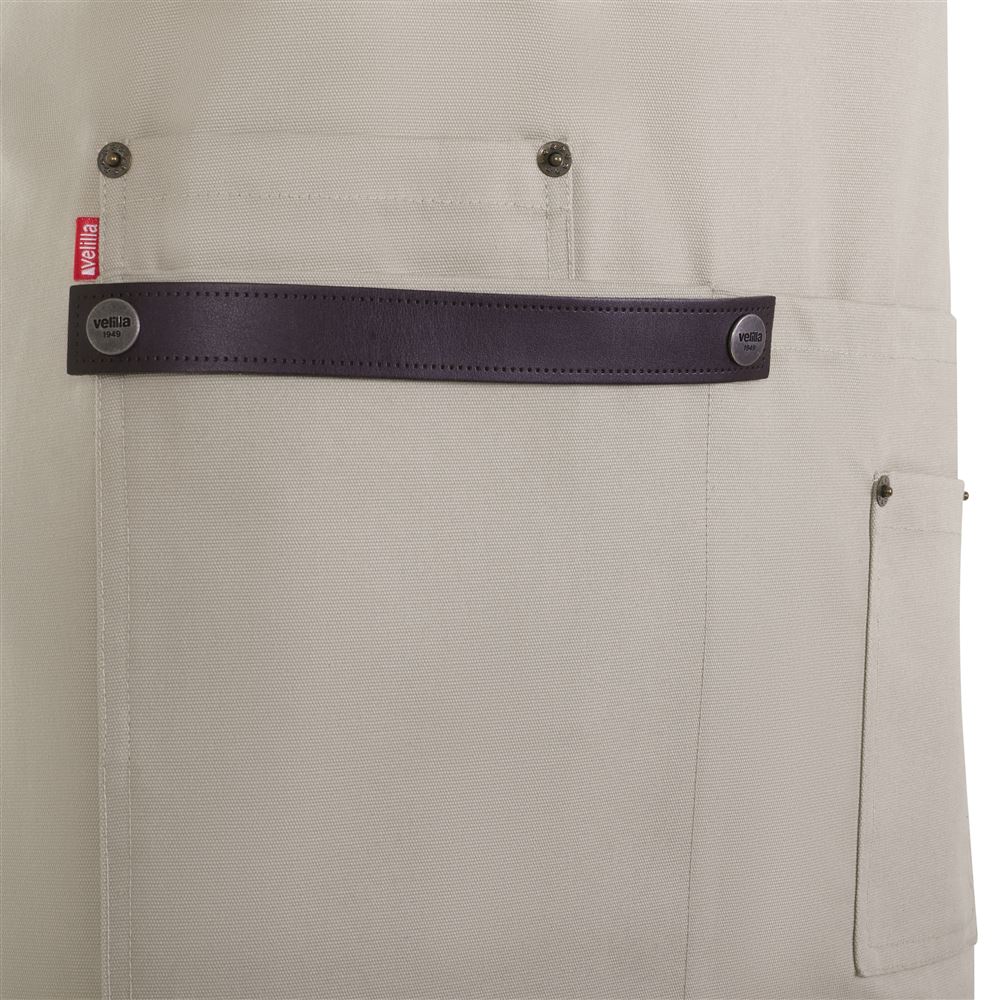 Praktische Details wie Nieten im Jeansstil, Innenaufhänger sowie vier funktionale Taschen (eine große Mitteltasche mit Innentasche, eine aufgesetzte Tasche und eine Brusttasche mit zwei Stiftfächern) machen die Schürze zu einem professionellen Begleiter in Küche, Werkstatt oder Atelier.